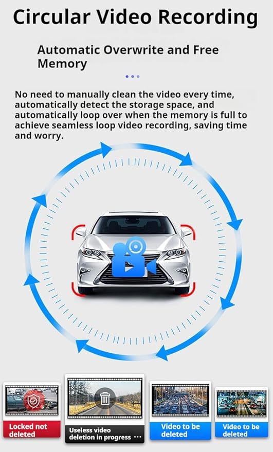 - 【تسجيل حلقي سلس ومقياس التسارع】- ستقوم كاميرات لوحة القيادة للسيارات تلقائيًا بالكتابة فوق أقدم مقاطع الفيديو مع الأحدث عندما تصل بطاقة SD إلى أقصى مساحة تخزين لها، لتحقيق تسجيل حلقي سلس. إذا كان مستشعر الجاذبية المدمج ناتجًا عن اصطدامات غير عادية، فإن كاميرا لوحة القيادة ستغلق الفيديو تلقائيًا لمنع الكتابة فوق مقاطع الفيديو المهمة أثناء التسجيل الحلقي وحفظها كدليل في حالة احتياجك إليها.
